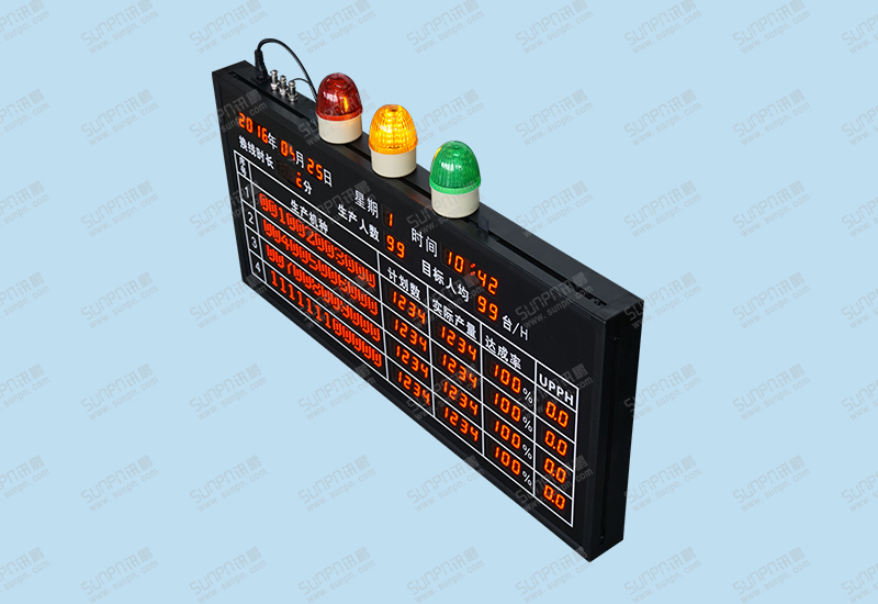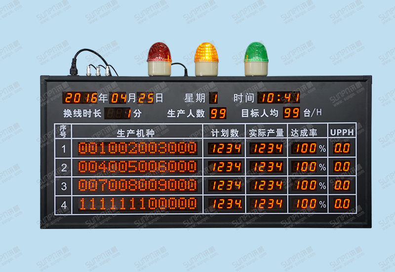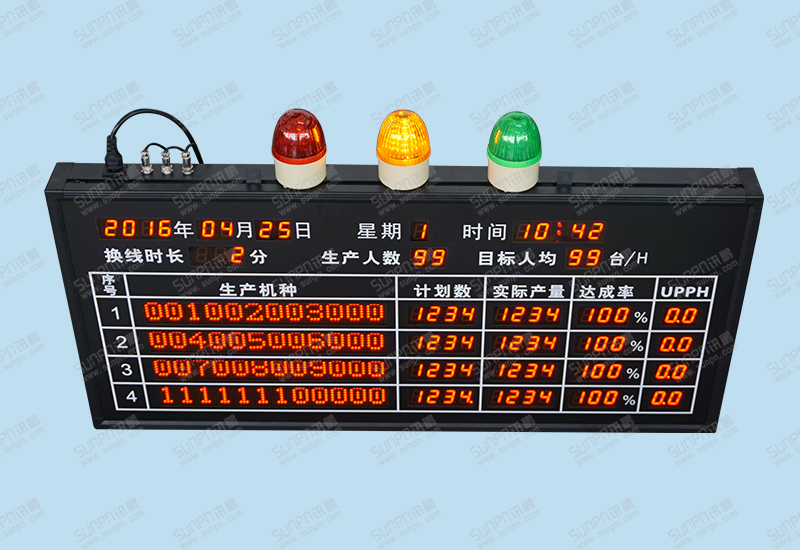 10、換線狀態下顯示黃色警燈,停機按鈕按下時顯示紅色警燈(計時和計數功能暫停),綠色警燈為正常生產。