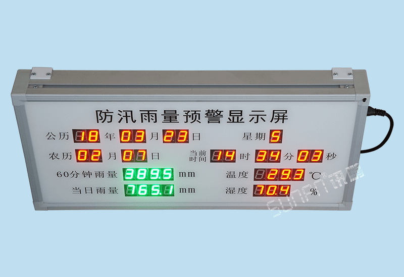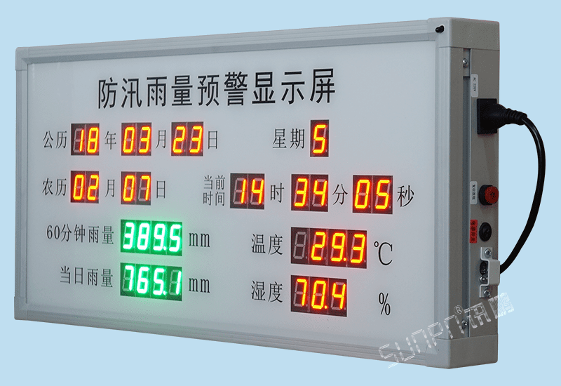 深圳訊鵬溫度濕度降雨實時監測RS485/RS232通訊屏系統尺寸外觀均可定制,防汛雨量預警顯示屏可顯示萬年歷公歷與農歷的年月日星期、當前時分秒、60分鐘雨量、當日雨量、溫度、濕度。外框材質采用鋁合金看板專用鋁型材;顯示材質紅光數碼管(尺寸可選配);面板材質采用有機玻璃與噴繪寫真/UV打印。時間自動運行,通過遙控器校時,也可有、通過rs232通訊校正時間。