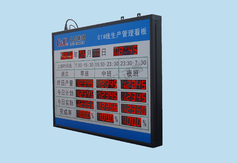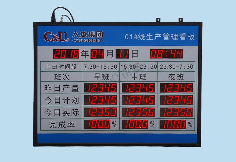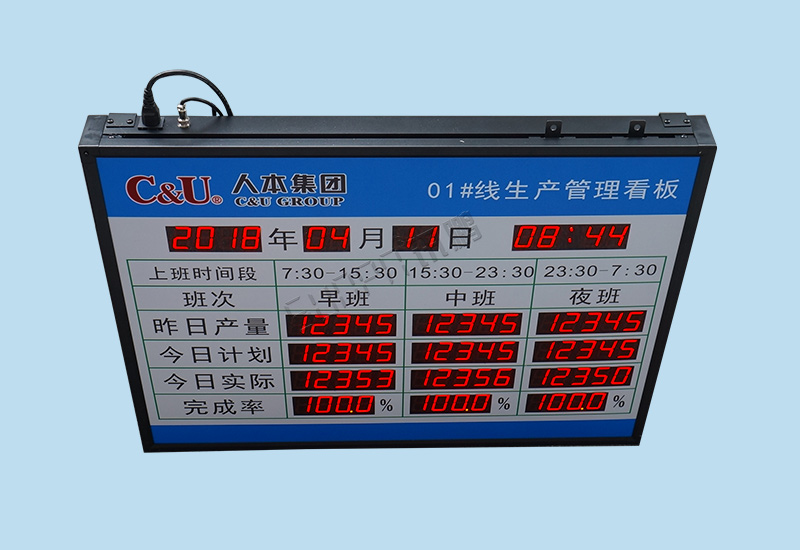 單機版LED生產管理看板是最簡單的一種生產管理工具,他只由工位觸發硬件(計數按鈕盒、光電開關、PLC等)、顯示看板(點陣看板、數碼管看板)組成。只作為單條產線數據采集的目視化管理。